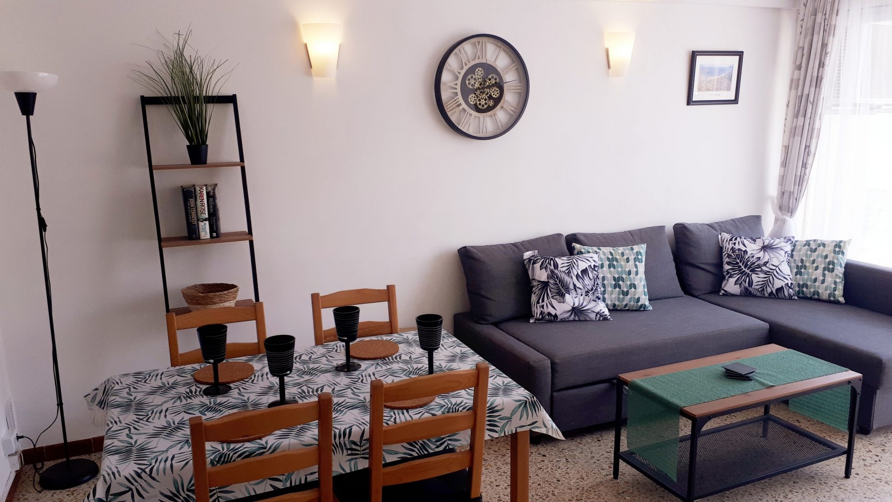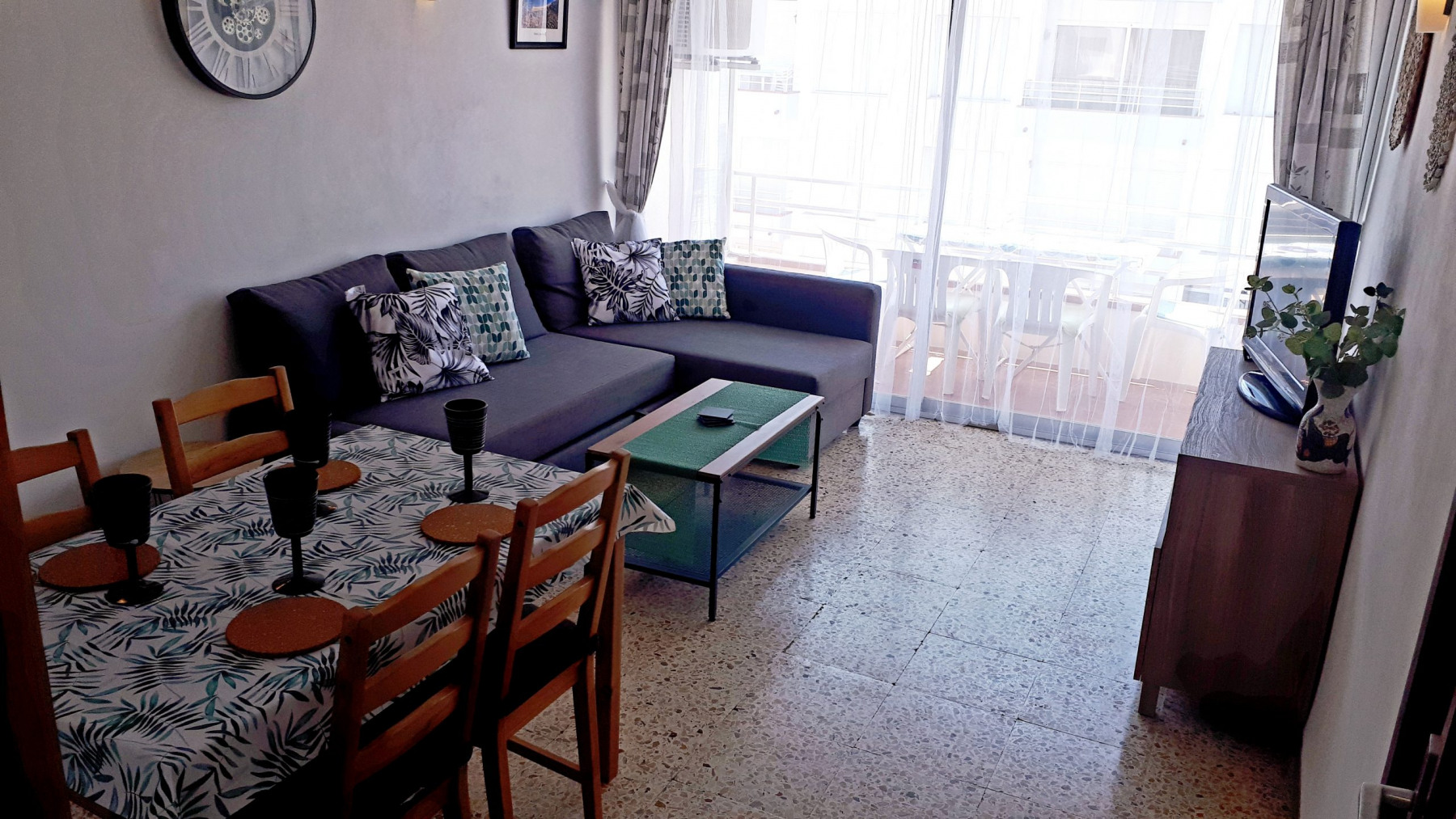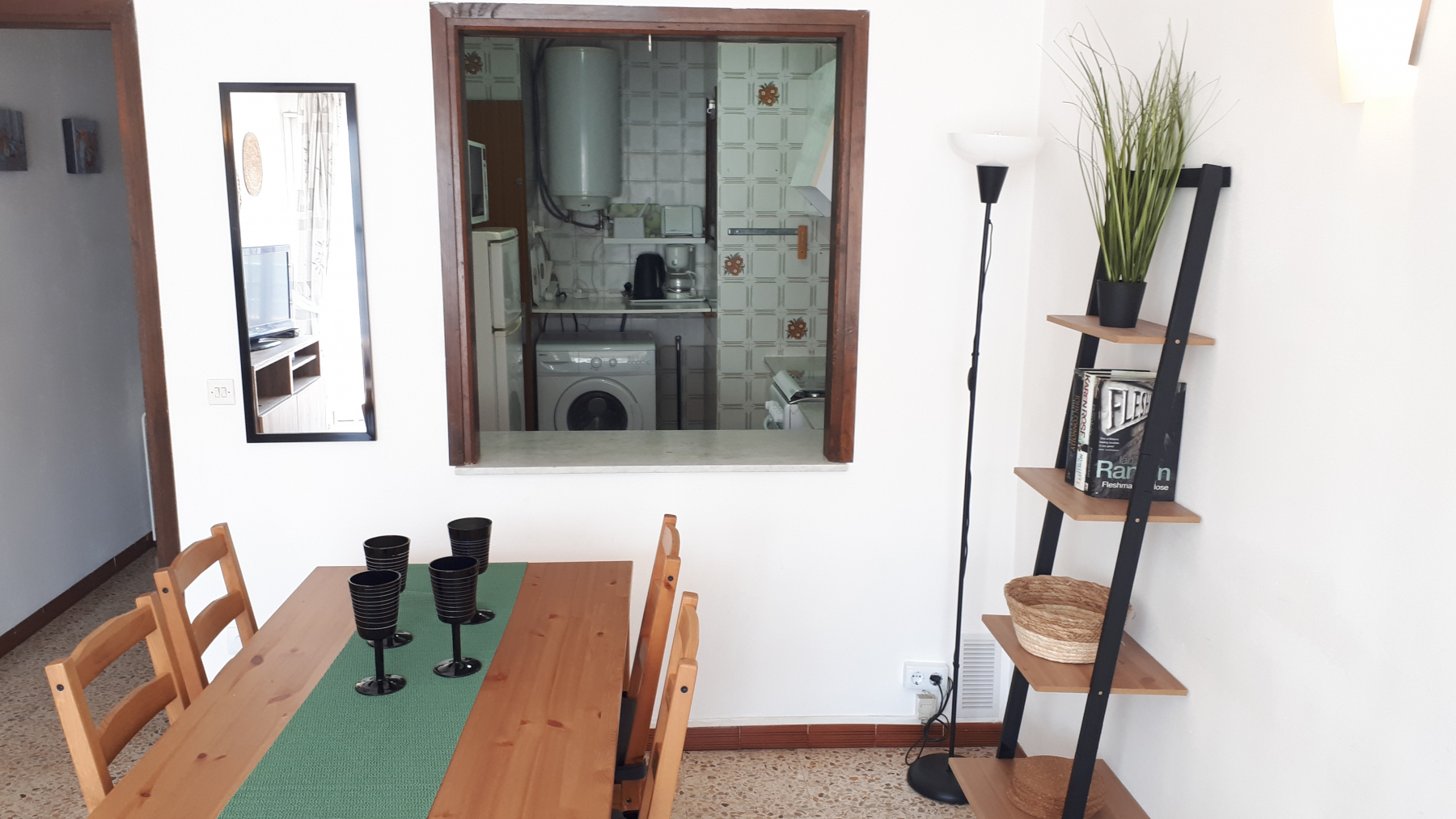 El saló s’obre a un balcó amb vistes al mar, i la finestra de l’habitació principal també ofereix vistes a la platja i al mar. La cuina completament equipada inclou una cuina amb forn, microones, nevera/congelador, bullidor i torradora. També hi ha una rentadora ubicada en una terrassa posterior. L’apartament té televisió espanyola.