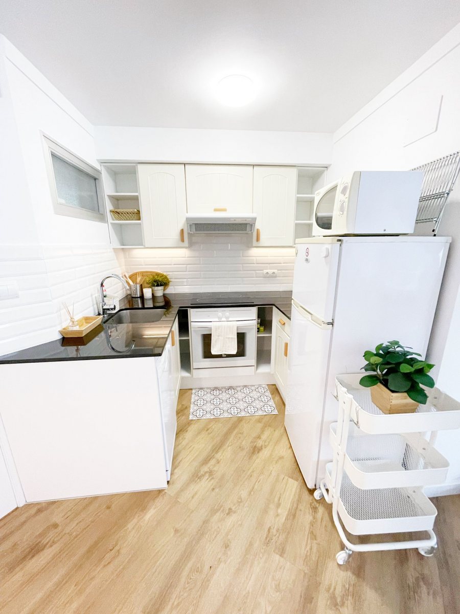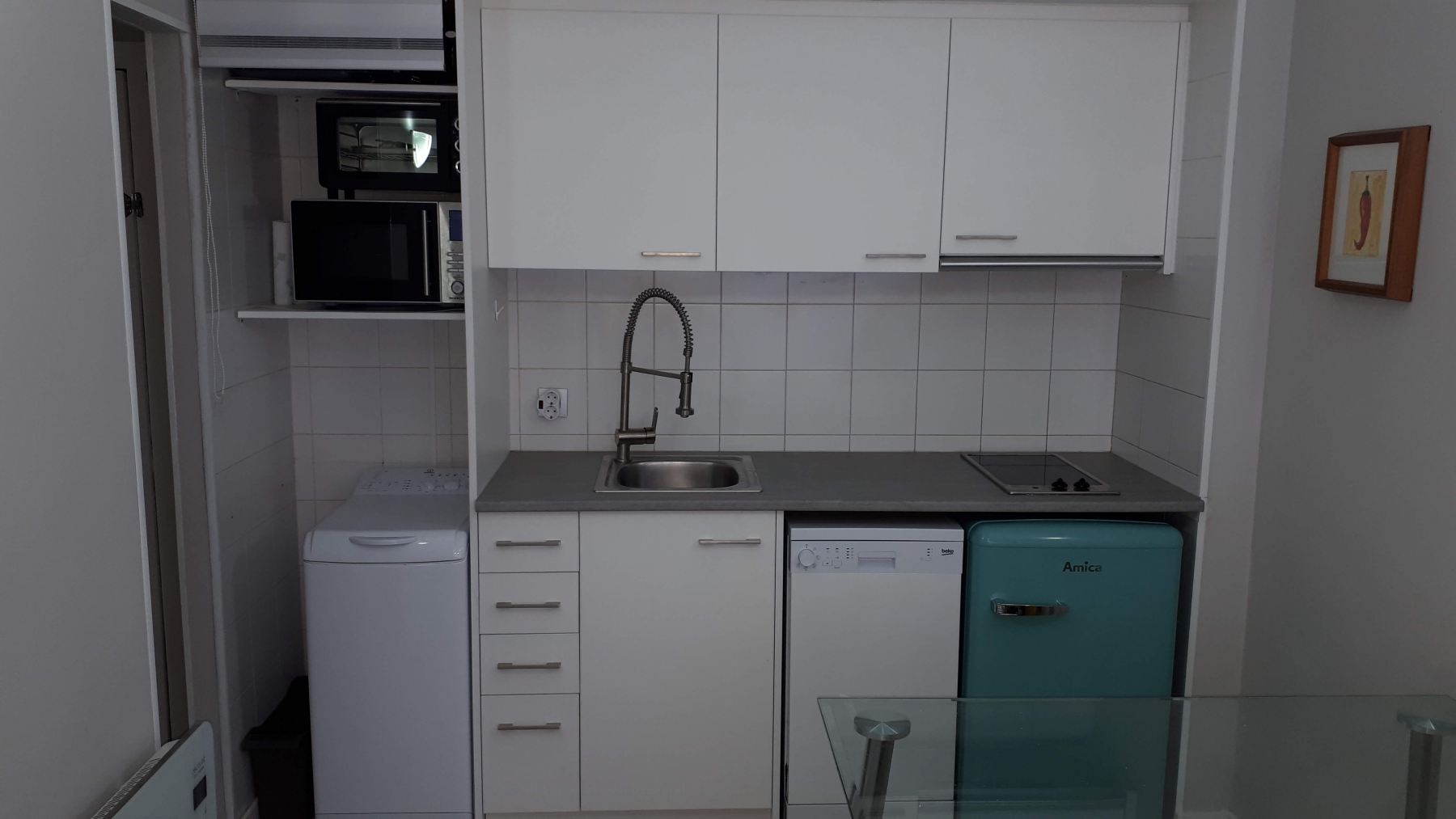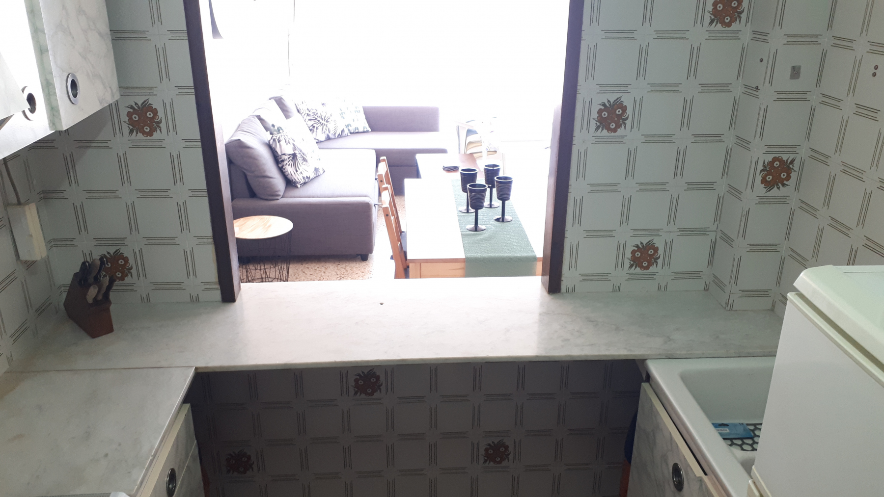 El saló s’obre a un balcó amb vistes al mar, i la finestra de l’habitació principal també ofereix vistes a la platja i al mar. La cuina completament equipada inclou una cuina amb forn, microones, nevera/congelador, bullidor i torradora. També hi ha una rentadora ubicada en una terrassa posterior. L’apartament té televisió espanyola.